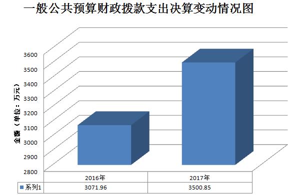2017年度一般公共预算财政拨款支出3500.85万元,占本年支出合计的100%。与2016年相比,一般公共预算财政拨款支出增加428.89万元,增长13.96%。主要是按照2017年决算口径就业补助资金纳入决算范围形成的支出增加。省级下达就业补助资金专款,主要用于对我市就业创业、职业培训、就业见习、求职创业等支出的补助资金。