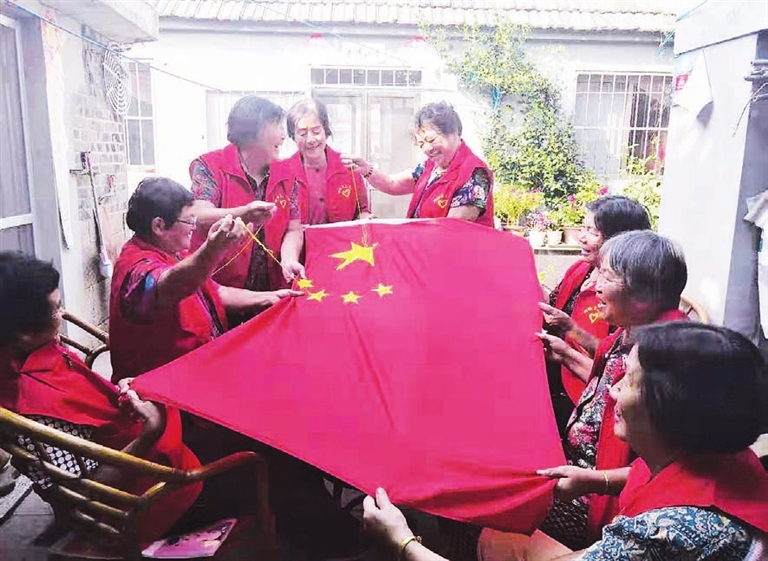 “线儿长,针儿密,祝福跟着针线走。”在俚岛镇烟墩角村妇女志愿者凑在一起绣红旗。大家一边畅谈生活变化,一边将心中的千份情万份爱化作一针一线,祝福祖国繁荣昌盛。