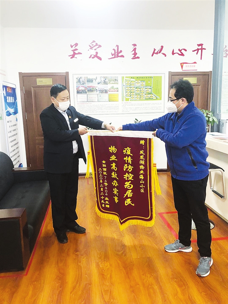 张纯红(左)代表物业接受业主赠送的锦旗。