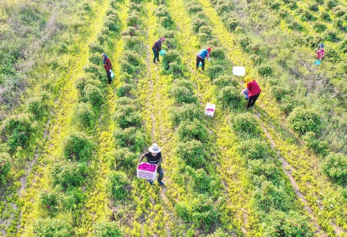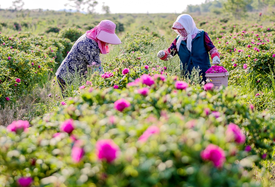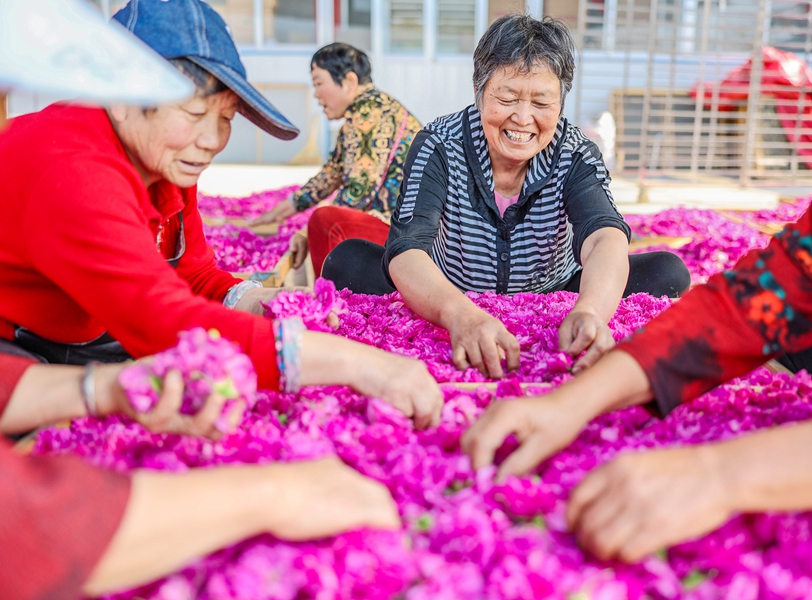 日前,在夏庄镇石硼丁家村“陌上花开”玫瑰园里,百亩玫瑰竞相绽放。花农们伴着花香采摘、分拣、烘干,生产的玫瑰花酱、精油等制品供不应求。