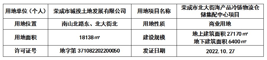 【批后公布】荣成市城投土地发展有限公司荣成市北大街海产品冷链物流仓储集配中心项目建设用地规划许可(出让)