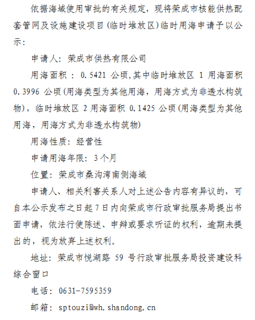 关于荣成市核能供热配套管网及设施建设项目(临时堆放区)临时用海批前公示