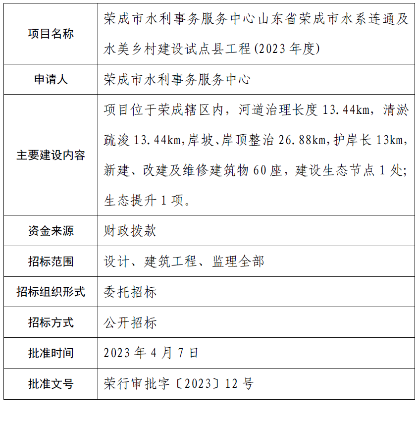 荣成市水利事务服务中心山东省荣成市水系连通及水美乡村建设试点县工程(2023年度)招标投标核准结果公示
