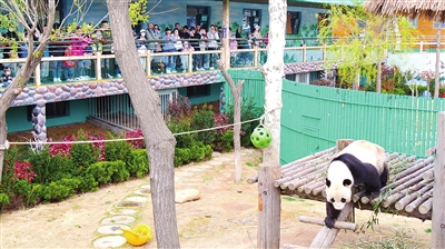 ▲憨态可掬的大熊猫引得游客驻足围观。