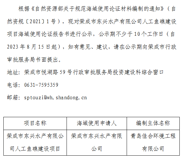 关于《荣成市东兴水产有限公司人工鱼礁建设项目海域使用论证报告书》评审前公示
