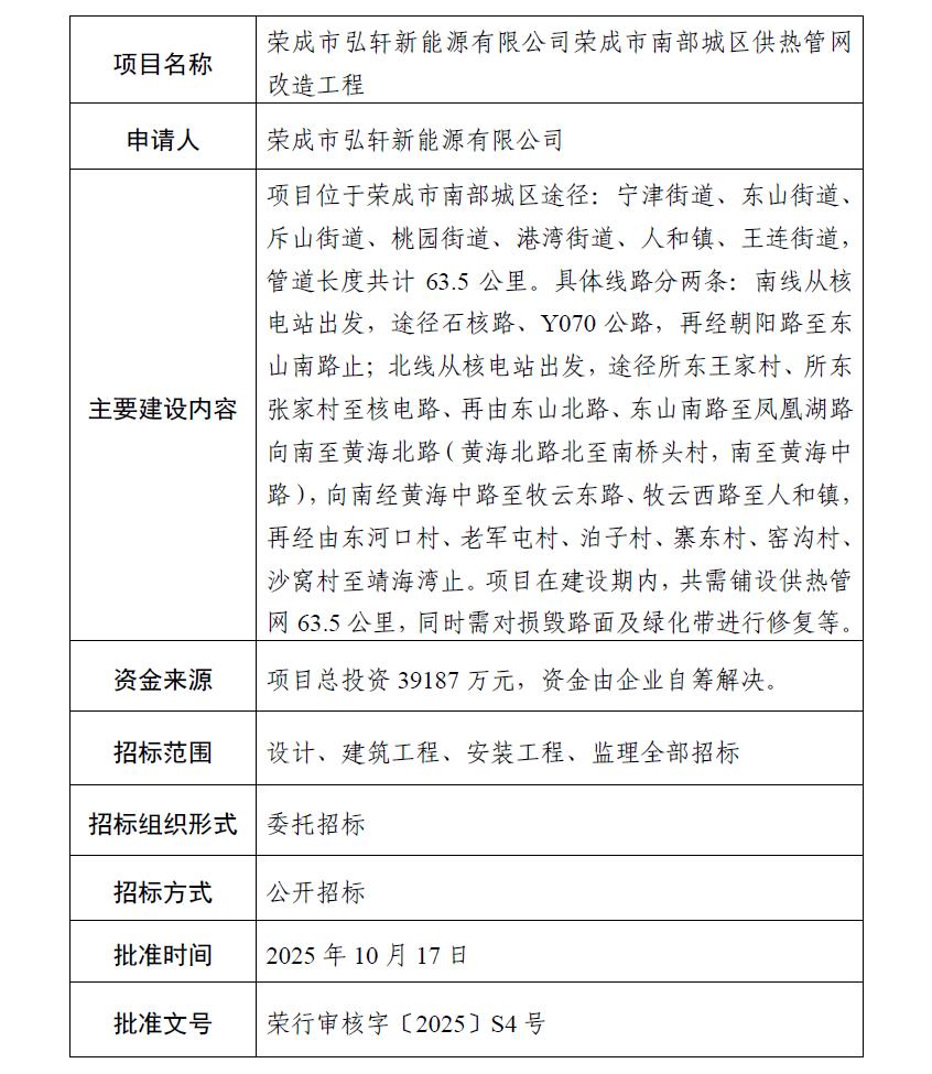 荣成市弘轩新能源有限公司荣成市南部城区供热管网改造工程招标投标核准结果公示