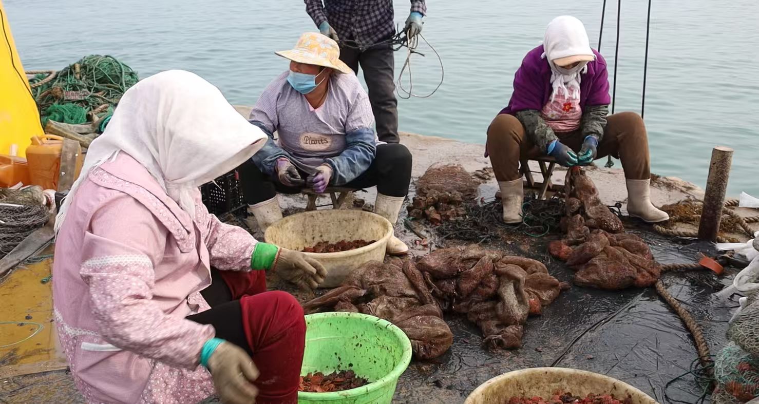 据养殖工人介绍,扇贝的生长周期较长,每年需要进行3次分苗作业,此次分苗的扇贝养殖密度约20枚/层。这一环节有助于筛选出优质扇贝苗,为后续养殖打下良好基础。
