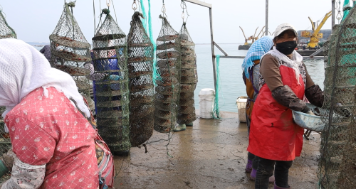 近日,在荣成市寻山街道寻山集团码头内,扇贝养殖户们正进行本年度第二次分苗作业。扇贝苗被仔细清洗筛选,疏散密度后,分拣出来重新装入网袋,投放回海继续养殖。