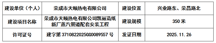 【批后公布】荣成市天颐热电有限公司凯丽造纸新厂蒸汽管道配套安装工程建设工程规划许可