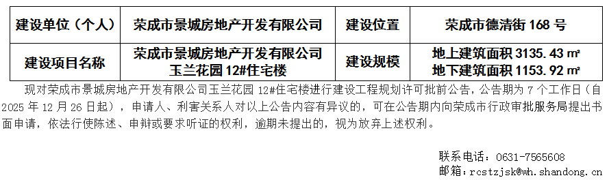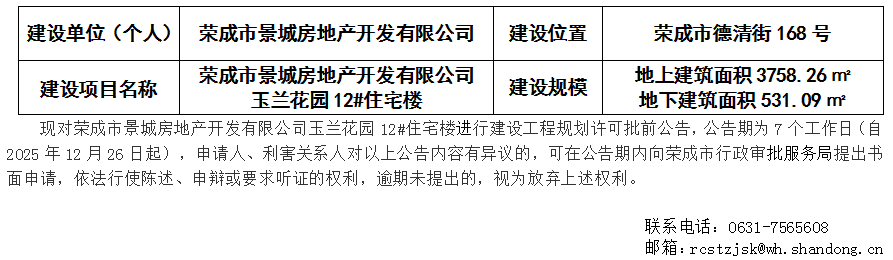 【批前公告】荣成市景城房地产开发有限公司玉兰花园12#住宅楼建设工程规划许可