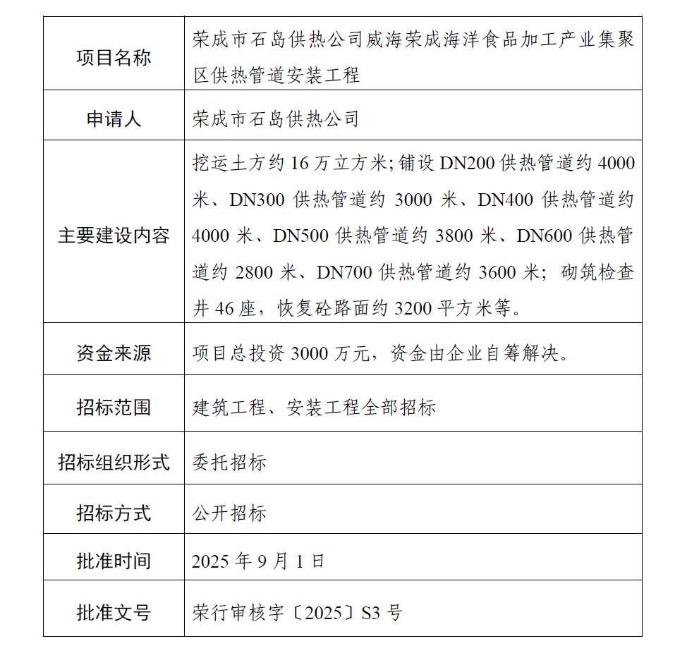荣成市石岛供热公司威海荣成海洋食品加工产业集聚区供热管道安装工程招标投标核准结果公示