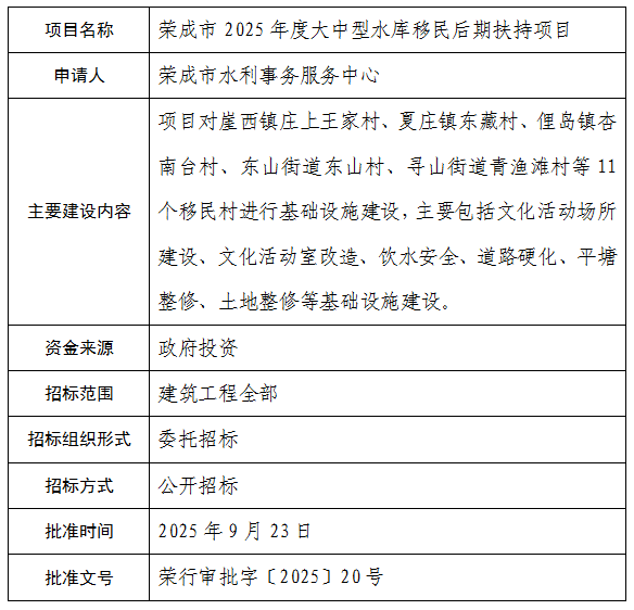 荣成市2025年度大中型水库移民后期扶持项目招标投标核准结果公示