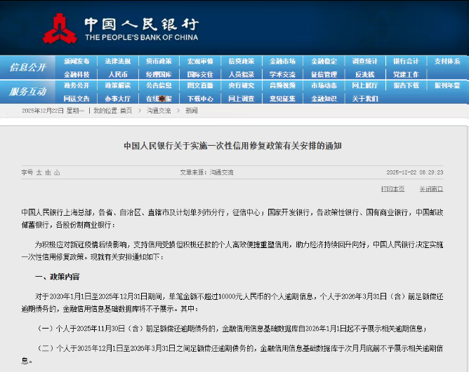 12月22日,中国人民银行对外发布一次性信用修复政策有关安排,符合相关条件的逾期信息,将不会在个人信用报告中予以展示。个人无需申请和操作,“免申即享”支持信用受损但积极还款的个人高效便捷重塑信用。