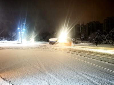 1月10日晚,市环卫集团出动大型除雪铲、滚刷30余台,采用“多车编组、梯形作业”的方式,对城区道路展开推雪作业,并安排10辆撒布机对学校路段、坡道、背街小巷进行撒布作业,及时恢复道路畅通。11日6时,市环卫集团组织600多名环卫人对责任区域积雪展开清理,保障市区交通通畅。