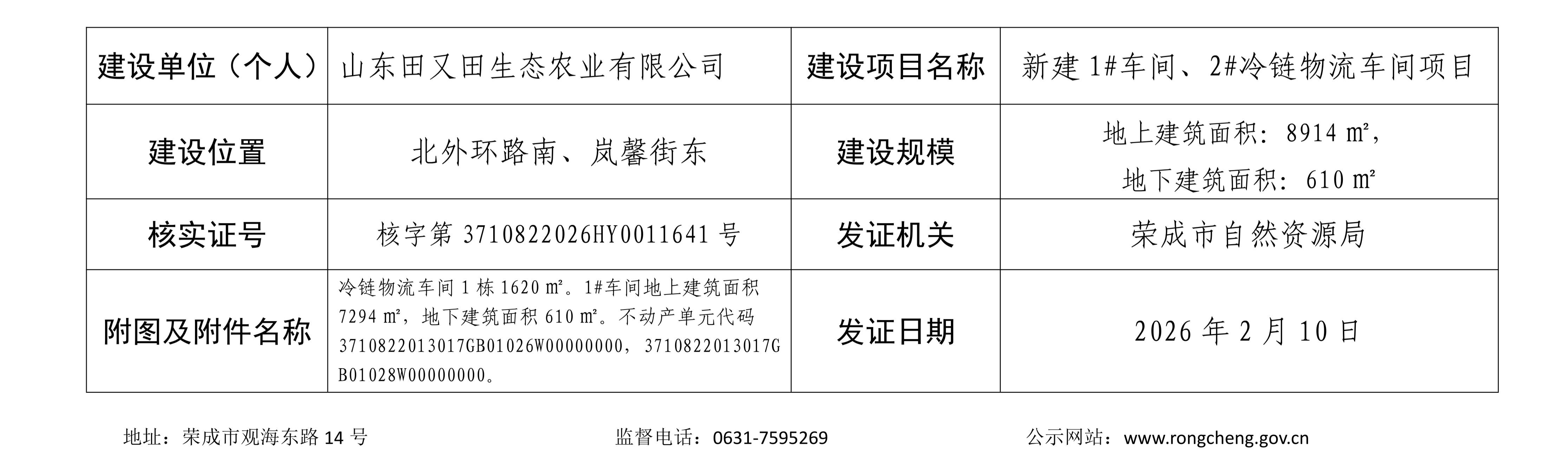 【批后公布】山东田又田生态农业有限公司新建1#车间、2#冷链物流车间项目建设工程竣工规划核实