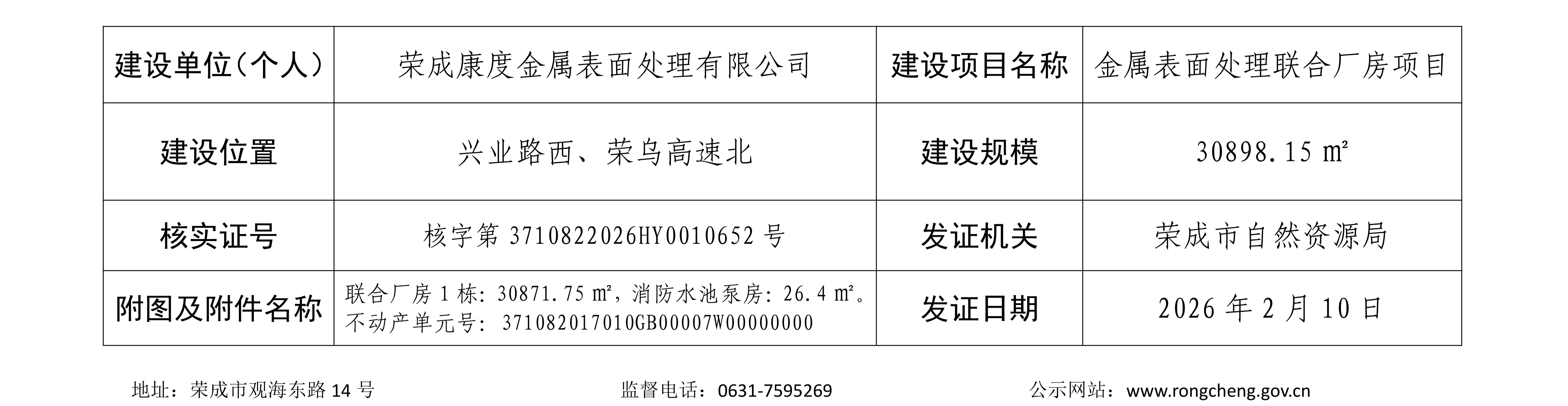 【批后公布】荣成康度金属表面处理有限公司金属表面处理联合厂房建设项目建设工程竣工规划核实