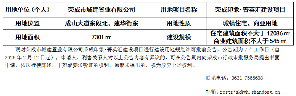 【批前公告】荣成市城建置业有限公司荣成印象・菁英汇建设项目建设用地规划许可(出让)