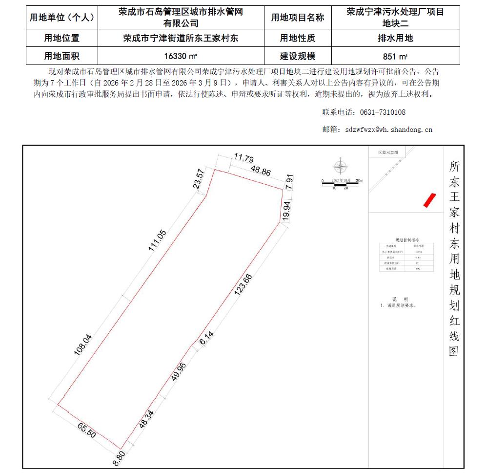 【批前公告】荣成市石岛管理区城市排水管网有限公司荣成宁津污水处理厂项目地块二建设用地规划许可(出让)