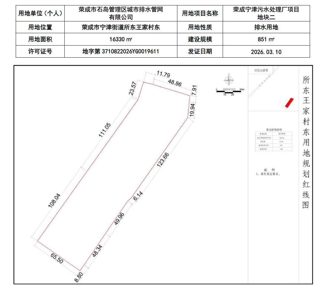 【批后公布】荣成市石岛管理区城市排水管网有限公司荣成宁津污水处理厂项目地块二建设用地规划许可(出让)