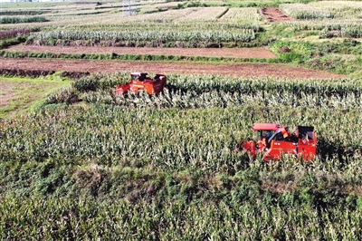 10月14日,在虎山镇西峰山后村,市农机部门抓住晴好天气,组织农机手驾驶玉米收获机在田间抢收玉米。